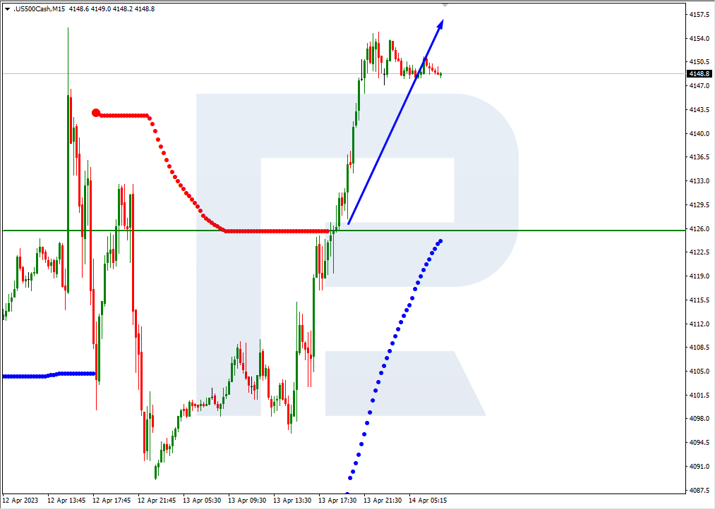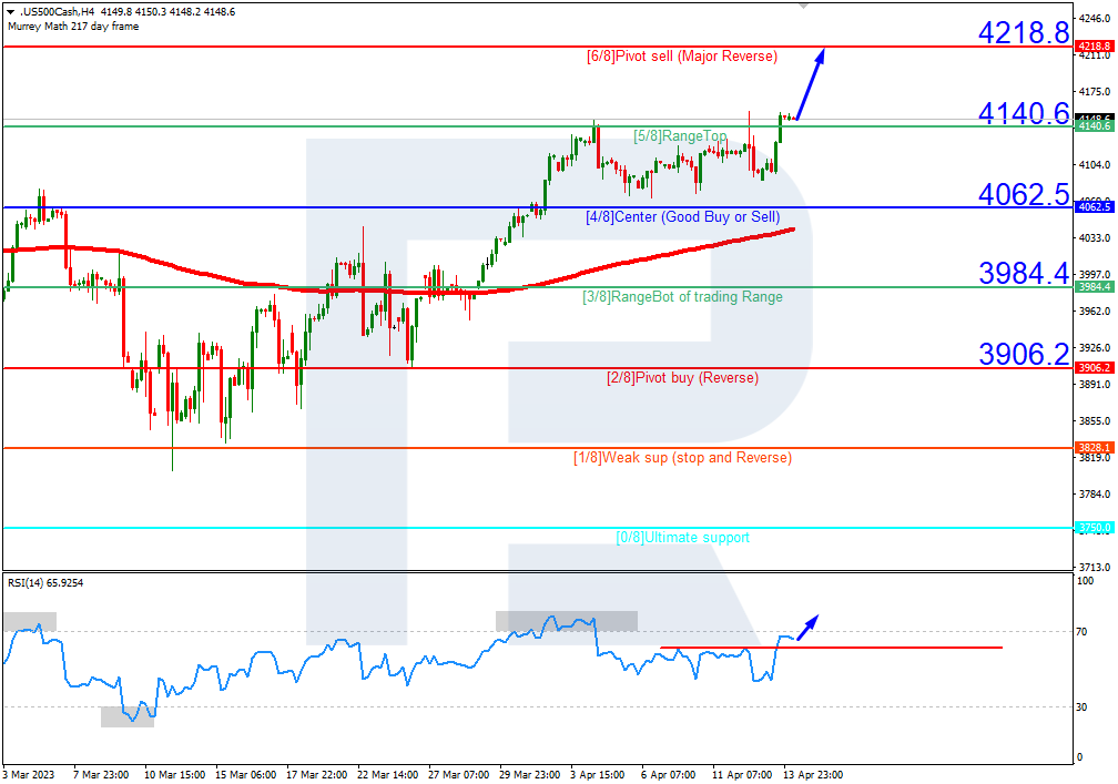 On H4, the quotes are above the 200-day Moving Average, which indicates the prevalence of an uptrend. The RSI has broken the support line. As a result, we should expect the price to rise to the resistance at 6/8 (4218.8). The scenario can be canceled by a downward breakout of the support at 5/8 (4140.6). In this case, the index could drop to 4/8 (4062.5).