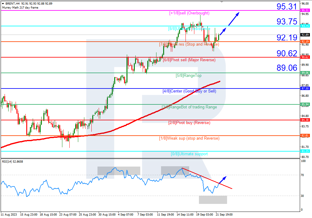 Brent quotes are above the 200-day Moving Average on H4, indicating the prevalence of an uptrend. The RSI is testing the resistance line. In this situation, the quotes are expected to rise above 8/8 (93.75), amounting to the resistance level of +1/8 (95.31) later. The scenario can be cancelled by a downward breakout of 7/8 (92.19). In this case, the quotes will be aiming at the support at 6/8 (90.62).