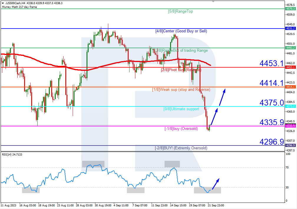 The S&P 500 index quotes and the RSI are in their respective oversold areas on H4. In this situation, a rebound from the -1/8 (4375.0) level is expected, from where the price could rise to the resistance at 1/8 (4414.1). The scenario can be cancelled by a downward breakout of the support at -1/8 (4335.9). In this case, the S&P 500 quotes could continue falling and might reach the -2/8 (4296.9) level.