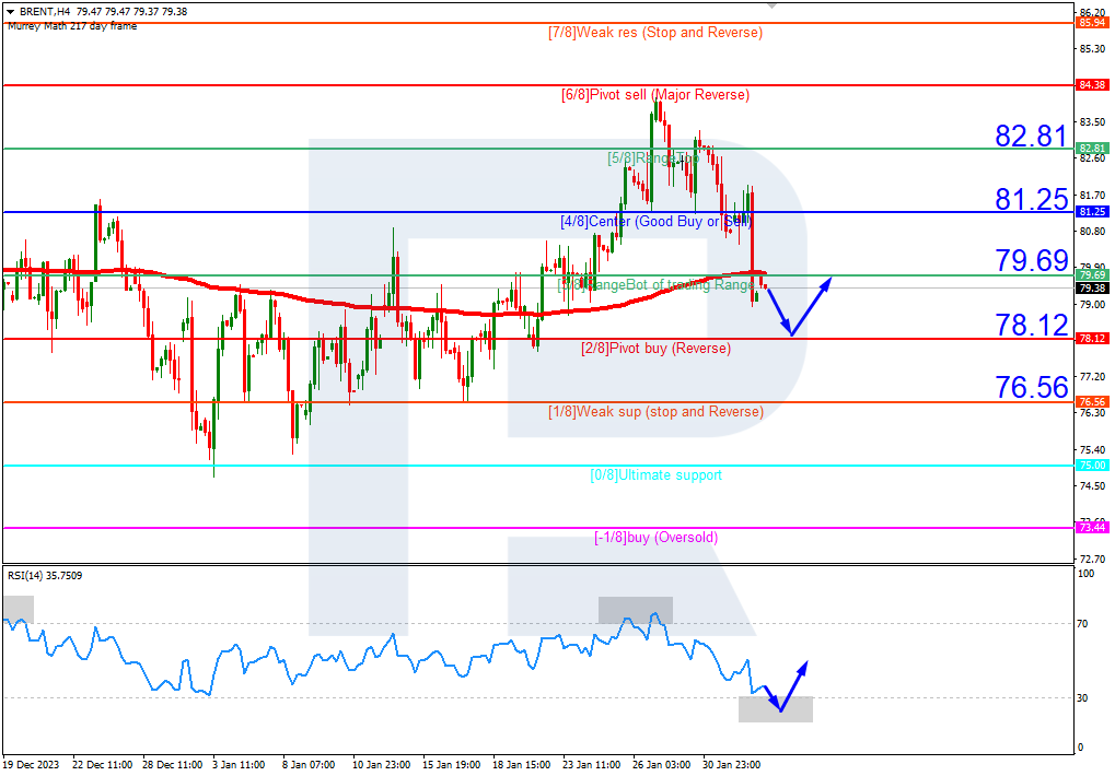 Brent quotes have broken below the 200-day Moving Average on H4, indicating the potential development of a downtrend. However, the RSI is approaching the oversold area. As a result, in this situation, the price is expected to test the 2/8 (78.12) level, rebound from it, and rise to the resistance at 3/8 (79.69). The scenario could be cancelled by rising above the 3/8 (79.69) level. In this case, the quotes might climb to the resistance at 4/8 (81.25).