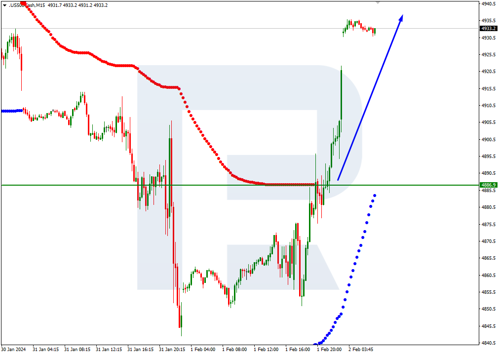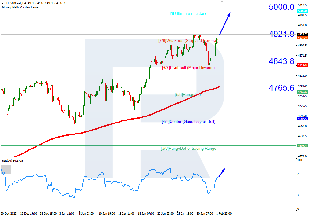 S&P 500 quotes are above the 200-day Moving Average on H4, indicating a prevailing uptrend. The RSI has broken the resistance level. In this situation, the quotes are expected to climb further to 8/8 (5000.0). The scenario could be cancelled by a downward breakout of the support level at 7/8 (4921.9). In this case, the S&P 500 index could drop to 6/8 (4843.8).