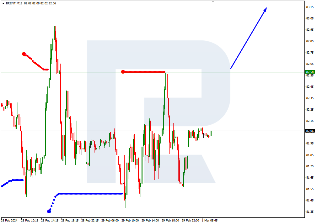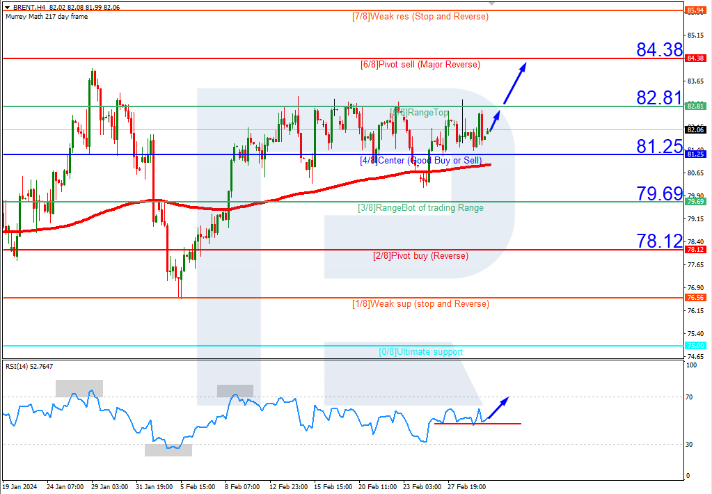 Brent quotes are above the 200-day Moving Average on H4, revealing the prevalence of an uptrend. The RSI has rebounded from the support line. In this situation, the quotes are expected to rise above 5/8 (82.81), later reaching the resistance at 6/8 (84.38). The scenario could be cancelled by a breakout of the 4/8 (81.25) level, which might lead to a trend reversal and a decline to the support at 3/8 (79.69).