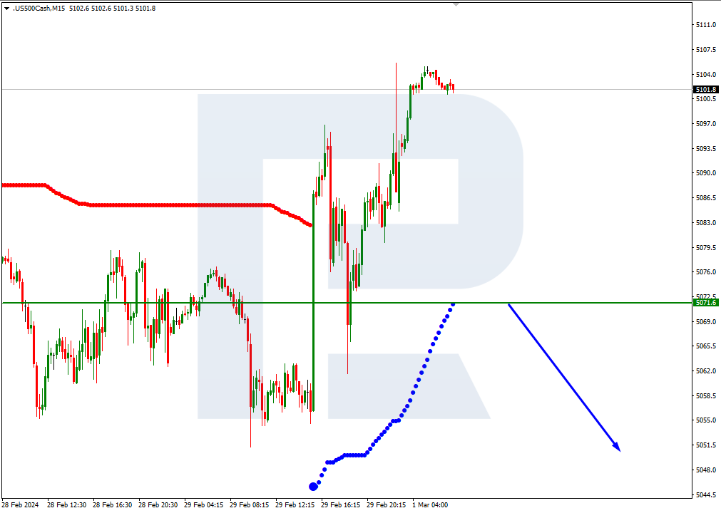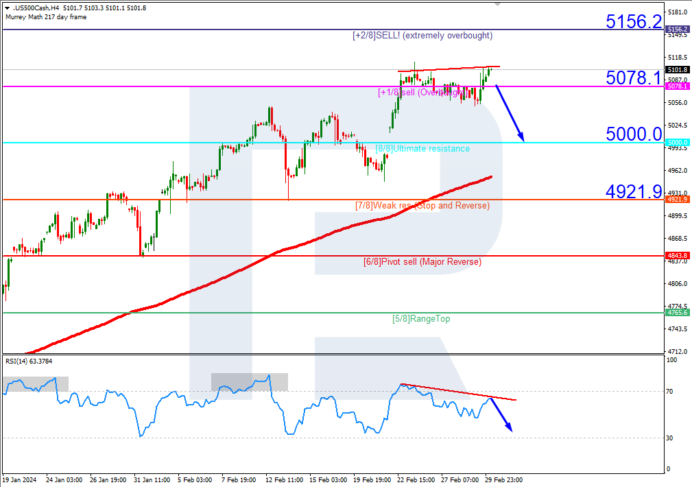 The S&P 500 index quotes are in the overbought area on H4. The RSI has formed a divergence. In this situation, the quotes are expected to break the +1/8 (5078.1) level and drop to the support at 8/8 (5000.0). The scenario could be cancelled by rising above the +2/8 (5156.2) level, which might lead to the restructuring of the Murrey indication, after which new price targets could be set.