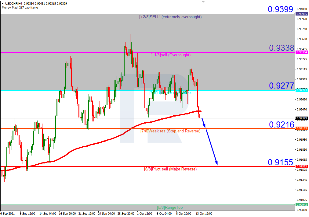 In the H4 chart, after breaking the 200-day Moving Average, USDCHF is trading below it, thus indicating a possible descending tendency. In this case, the price is expected to test 7/8, break it, and then continue falling to reach the support at 6/8. However, this scenario may be cancelled if the price breaks 8/8 to the upside. After that, the instrument may continue growing to re-test +1/8.