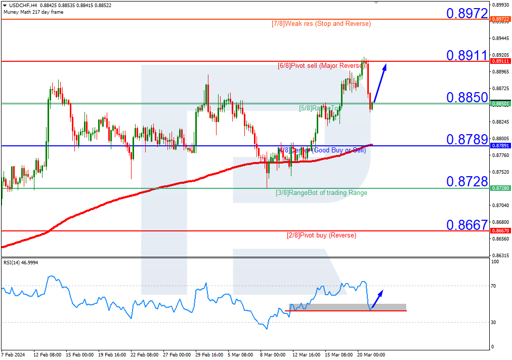 USDCHF quotes are above the 200-day Moving Average on H4, indicating a prevailing uptrend. The RSI has rebounded from the support line. In this situation, the price is expected to rebound from the 5/8 (0.8850) level and rise to the resistance at 6/8 (0.8911). The scenario could be cancelled by breaking below the support at 4/8 (0.8789), which could lead to a trend reversal, pushing the pair down to 3/8 (0.8728).
