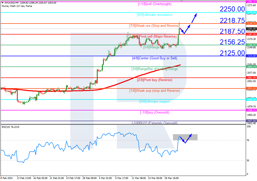 Gold quotes are above the 200-day Moving Average on H4, which indicates a prevailing uptrend. The RSI has reached the overbought area. In this situation, the price is expected to test the 6/8 (2187.50) level and rebound from it, rising to the resistance at 8/8 (2250.00). The scenario could be cancelled by a breakout of the 6/8 (2187.50) level. In this case, Gold quotes might decline to the support at 4/8 (2125.00).