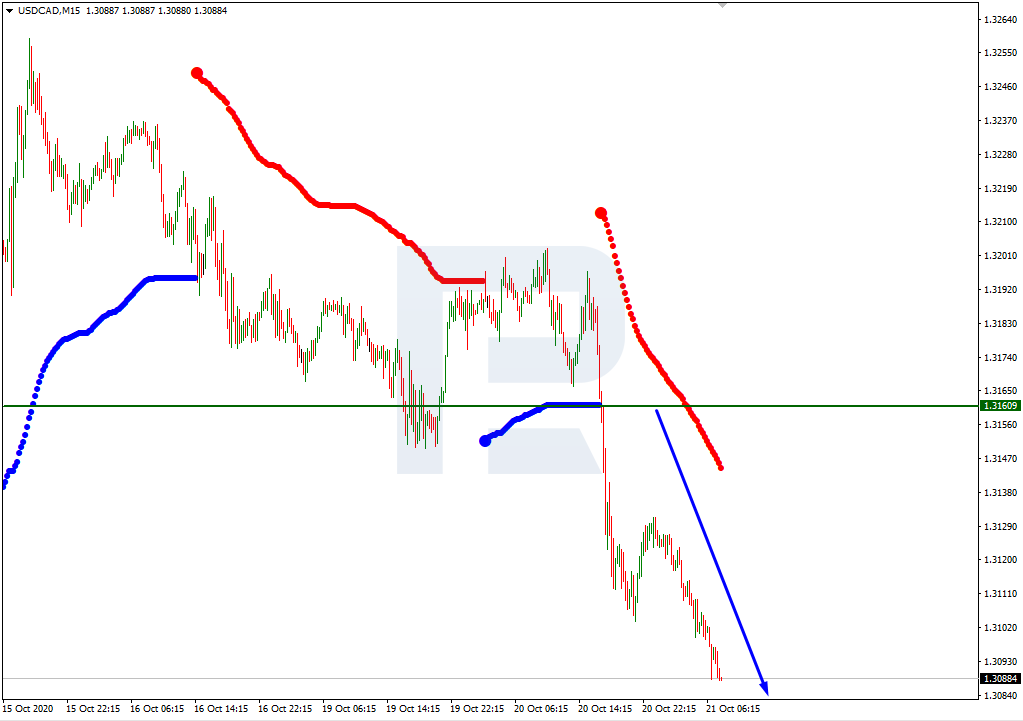 As we can see in the M15 chart, the pair has broken the downside line of the VoltyChannel indicator and, as a result, continue moving downwards.