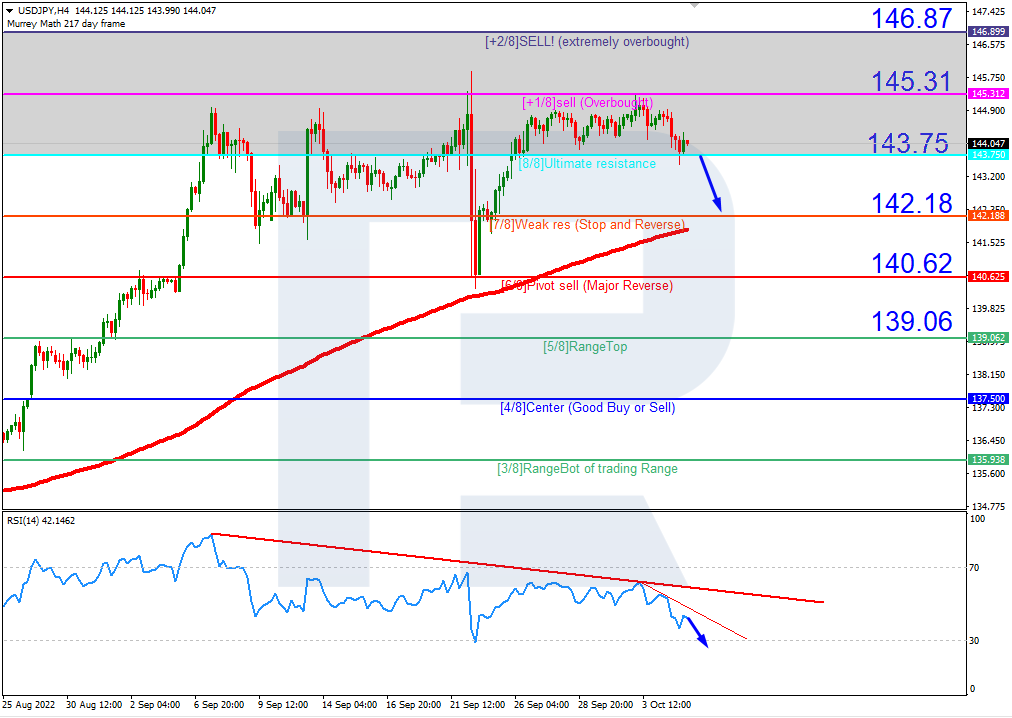 In the H4 chart, USDJPY is trading within the “overbought area”. The Relative Strength Index is slowly moving towards 30. In this case, the pair is expected to break 8/8 (143.75) and then continue falling to reach the support at 7/8 (142.18). However, this scenario may be cancelled if the price breaks the resistance +1/8 (145.31) to the upside. After that, the instrument may grow towards +2/8 (146.87).
