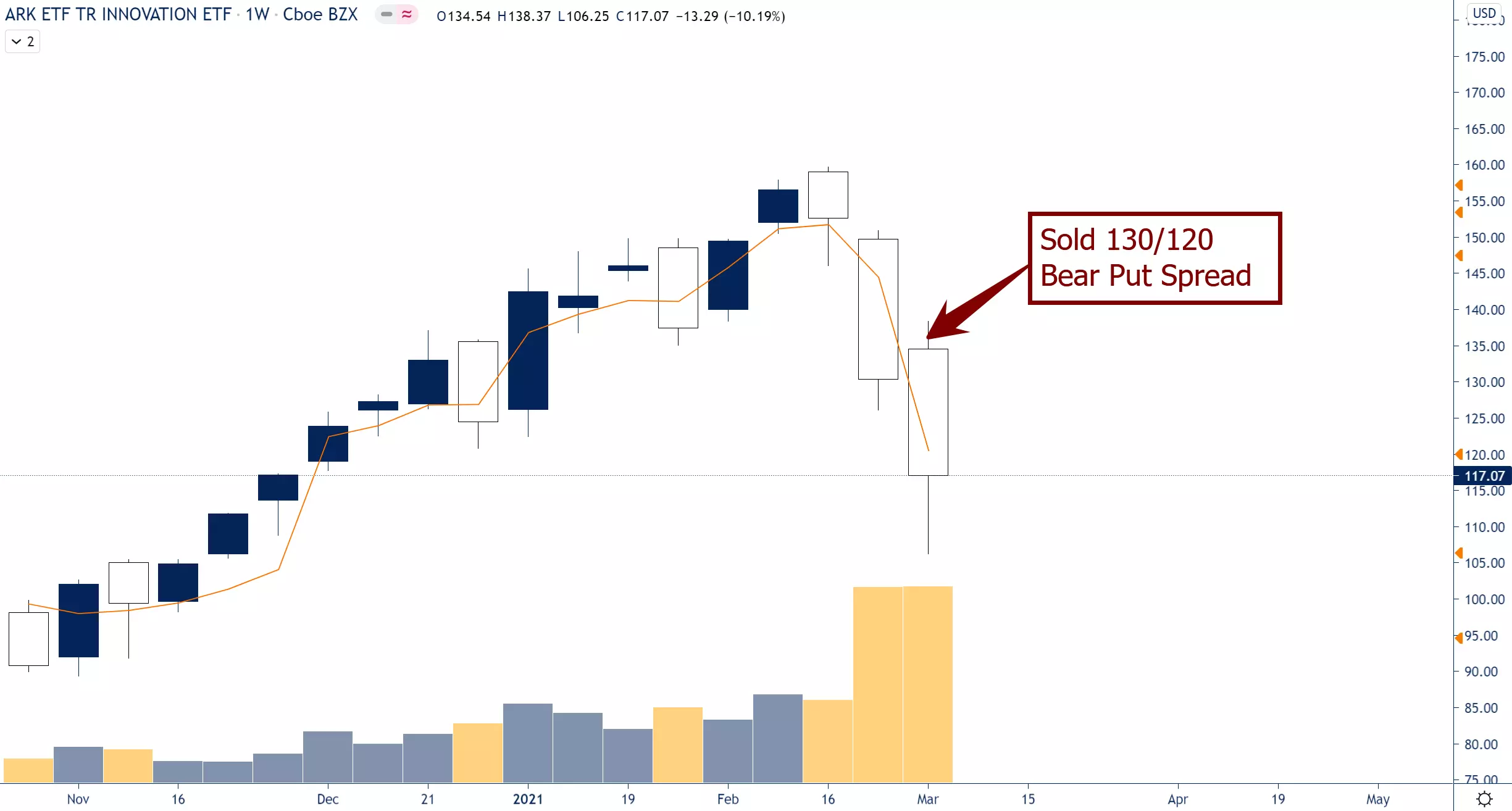That meant if ARKK sold all the way from $133 down to $120, we'd hit max profit on that spread.