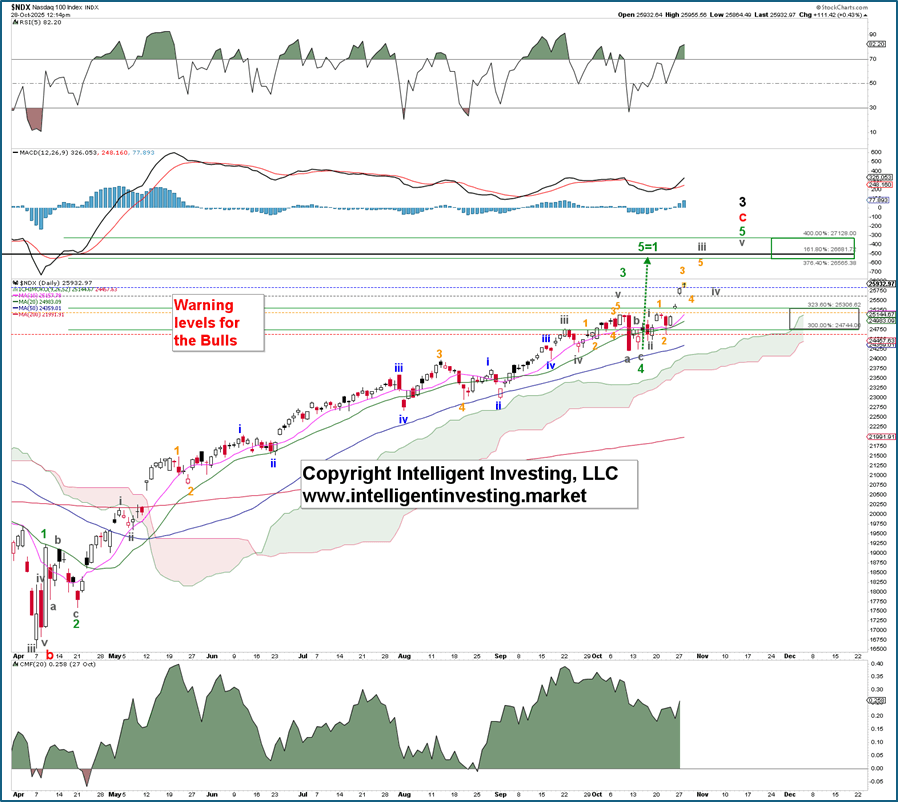 Fast forward, the index peaked at 25195 on October 10, dropped to 24256 on October 14, and started making new all-time highs (ATHs) last Friday, October 24. Therefore, the index peaked as expected but did not reach the ideal W-4 target zone. As we stated, in bull markets, downside disappoints!