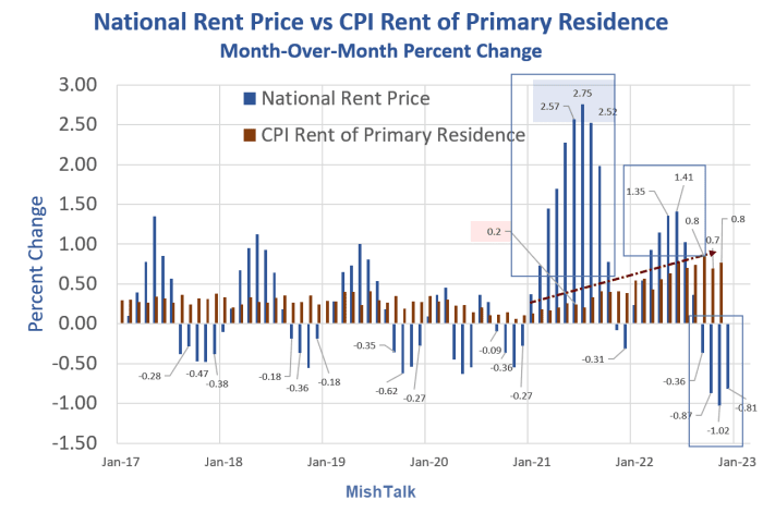 Last month I commented "I suspect we have strong increases in rent in the CPI data despite the declines of ApartmentList for at least the rest of the year, and if so continuing into 2023."