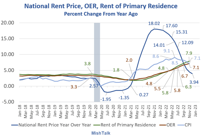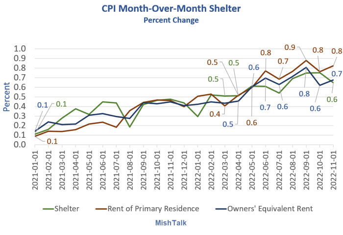 CPI Shelter, Rent of Primary Residence, Owners' Equivalent Rent (OER), chart by Mish