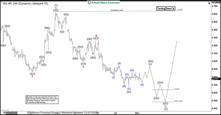 Here’s the Elliott wave Chart from the 12/03/2023 weekend update. In which, rally to $3.630 high ended the wave (1) & made a pullback in wave (2). The internals of that pullback unfolded as Elliott wave zigzag structure where wave A ended at $2.989 low. A bounce to $3.275 high ended wave B bounce. Then started the next leg lower in wave C towards $2.637- $2.485 equal legs area. From there, buyers were expected to appear looking for new highs ideally or for a 3-wave bounce minimum.