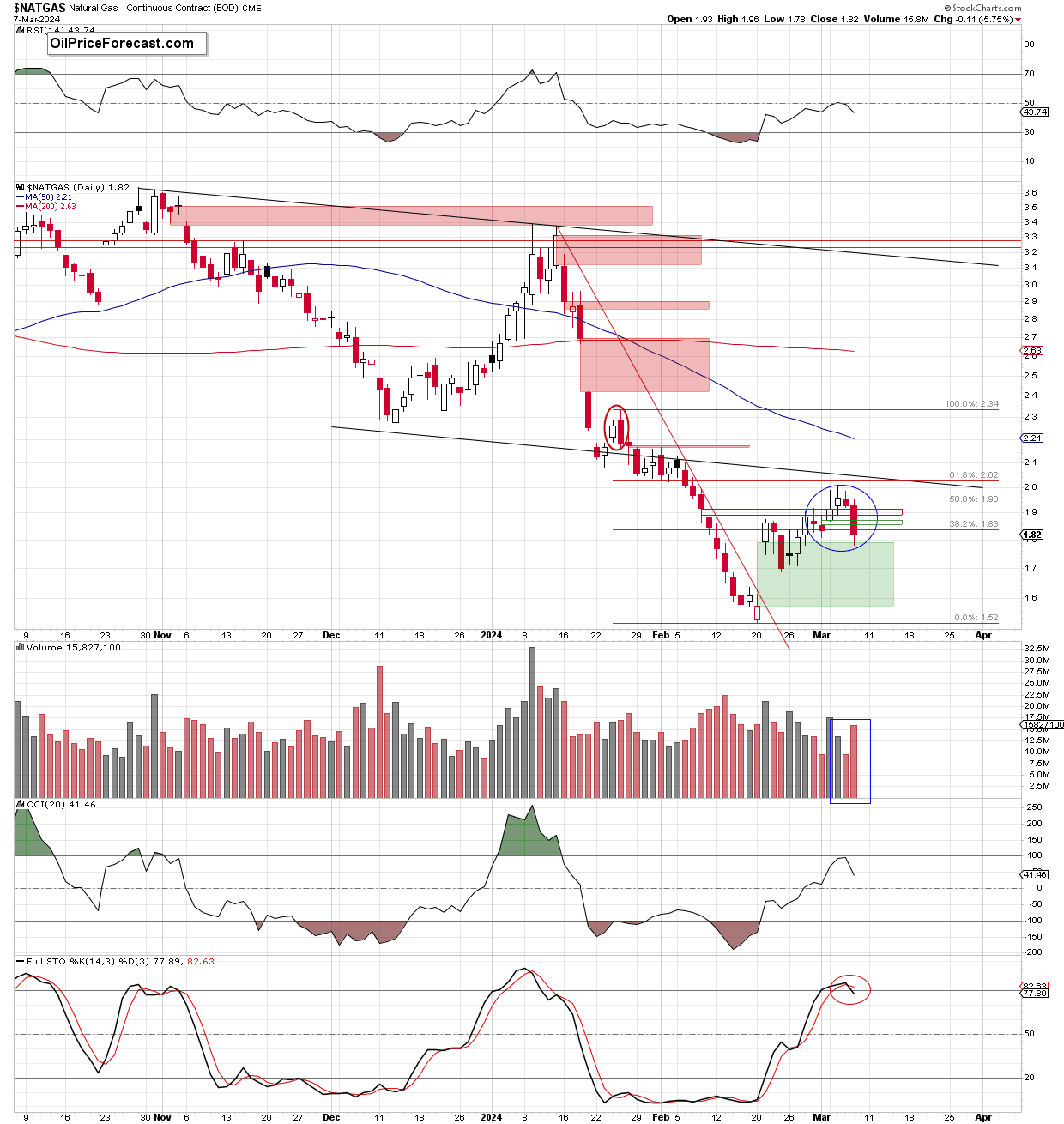 Thanks to the mentioned price action, natural gas extended losses during yesterday’s session, losing 5.75% and closing the green supportive gap formed on Mar.4.