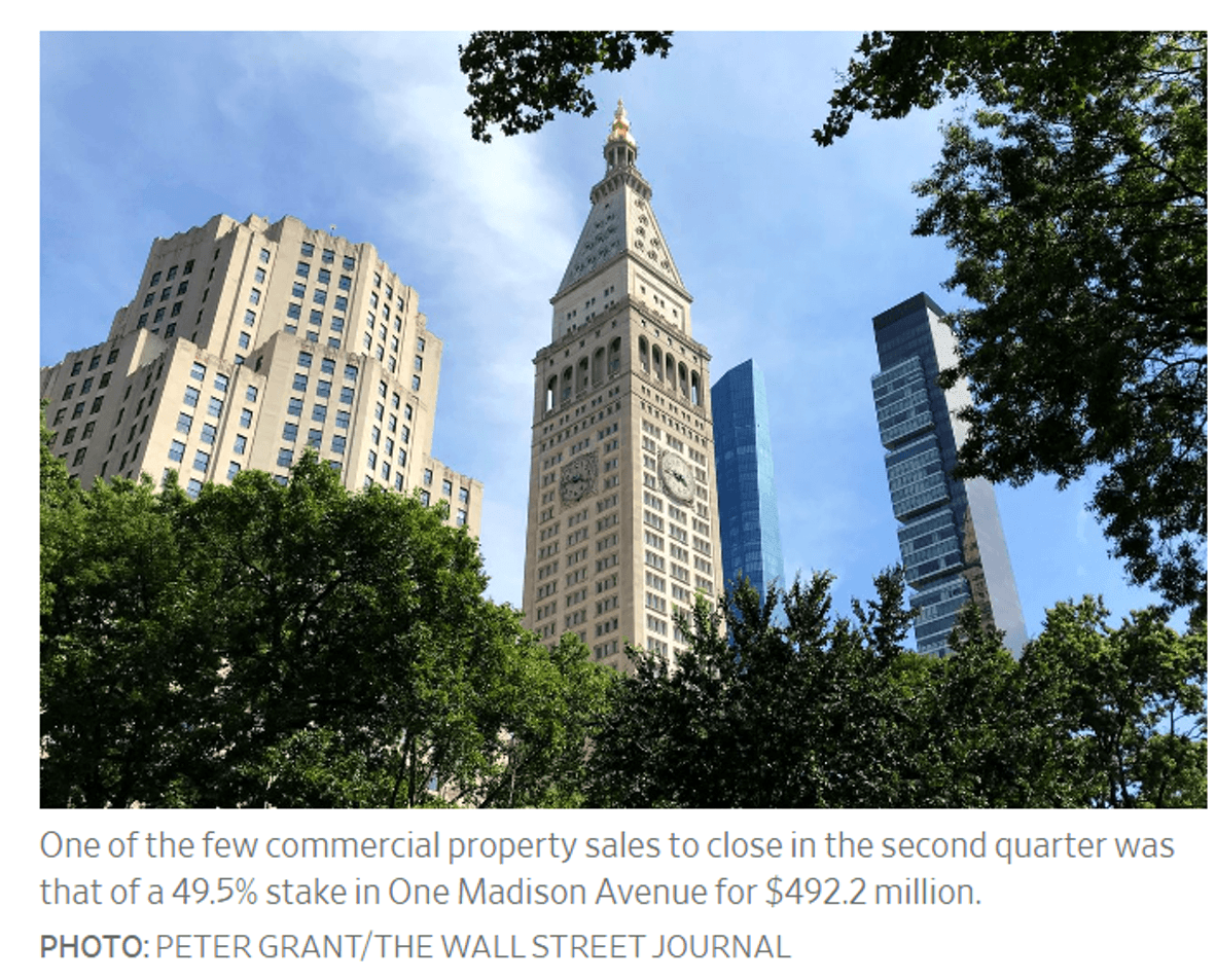 Investors purchased only 170 properties valued at $3.6 billion between April 1 and the end of June, the lowest number of transactions for a three-month period since the second quarter of 2009, according to B6 Real Estate Advisors. There were 523 deals valued at $7.6 billion in the second quarter of 2019, said the firm, which specializes in New York commercial property sales.