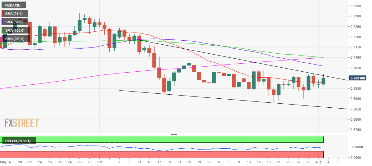 On an upbeat NZ employment report, the kiwi buyers could ignore the bearish warning and break through the wedge hurdle to accelerate the recent upside towards the descending 50-day SMA 0.7058. Should the data disappoint markets a retracement towards the August 2 lows of 0.6952 cannot be ruled out. Further south, the 0.6900 round number could be the level to beat for the NZD bears.