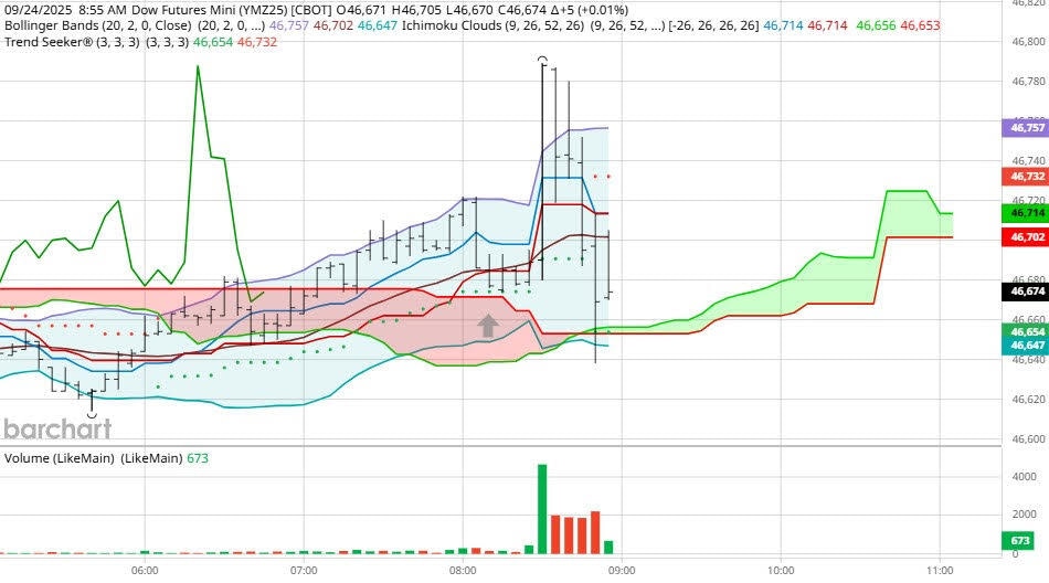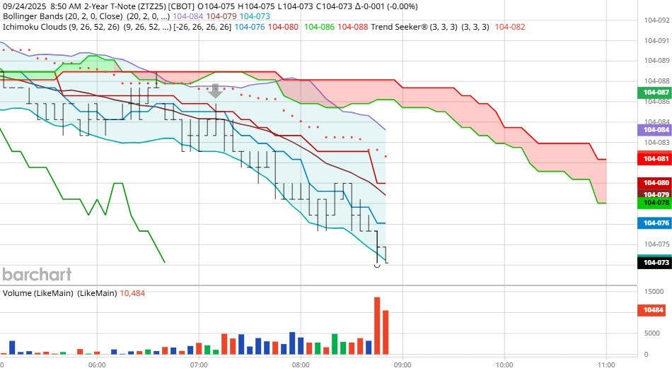 Yesterday the ZT dived Lower at around 8:10 AM EST with no real eco news items pending. The Dow climbed Higher at the same time. Look at the charts below and you'll see a pattern for both assets. The Dow climbed Higher at around 8:10 AM EST and the ZT dived Lower at around the same time. These charts represent the newest version of Bar Charts, and I've changed the timeframe to a 15-minute chart to display better. This represented a Short opportunity on the 2-year note, as a trader you could have netted about a dozen plus ticks per contract on this trade. Each tick is worth $6.25. Please note: the front month for ZT is now Dec '25 and the Dow is now Dec '25. I've changed the format to filled Candlesticks (not hollow) such that it may be more apparent and visible.