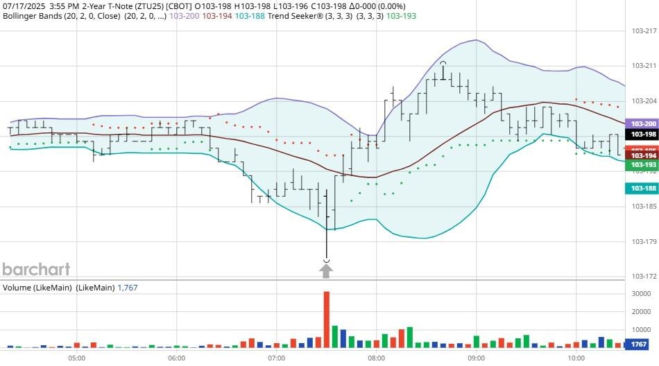 Yesterday the ZT climbed Higher at around 8:30 AM EST with various reports pending. The Dow dived Lower at the same time. Look at the charts below and you'll see a pattern for both assets. The Dow dived Lower at 8:30 AM EST and the ZT climbed Higher at around the same time. These charts represent the newest version of Bar Charts, and I've changed the timeframe to a 15-minute chart to display better. This represented a Long opportunity on the 2-year note, as a trader you could have netted about 30 plus ticks per contract on this trade. Each tick is worth $6.25. Please note: the front month for ZT is now Sep '25 and the Dow is now Sep '25. I've changed the format to filled Candlesticks (not hollow) such that it may be more apparent and visible.