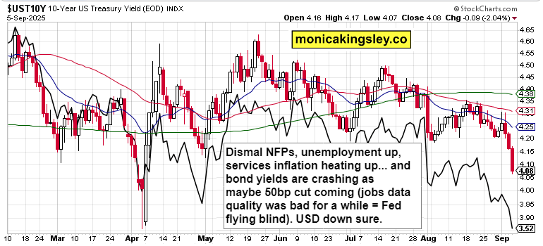 S&P 500 was positioned for jobs data upside ever since Thursday‘s steady buying and premarket consolidation – and the push came. Prices reversed, a little undershot Thursday‘s lows, and recovered – duly recovered as I looked for prices to go up later in the day. Russell 2000 did of course way better, rates retreated and USD went down significantly. That‘s all part of the great stock market rotation, and uncertainty trade sending up precious metals of course too – clients benefited, and the same about oil declining (markets did salivate on stimulus prospects via rate cuts, yet got second thoughts about economy strength aka isn‘t the Fed cutting too late? Can 25bp even be enough?)