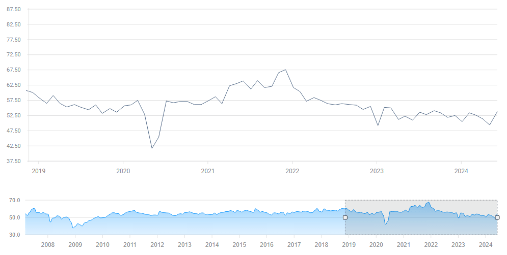 Wednesday, 14:00 GMT. Most Americans work in the services sector, and this forward-looking snapshot is a good gauge of the broader economy. The ISM Services PMI hit 53.8 points in May, indicating moderate growth. A drop to 52.5 is on the cards for June.