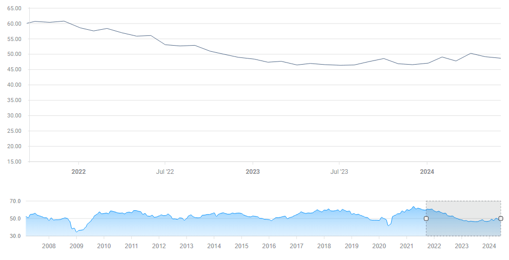Like with other releases, the sweet spot for markets is in the middle – ongoing moderate growth that would allow for rate cuts yet avoid a recession. A drop below 50 would trigger concerns of a downturn, while a renewed acceleration would push rate cuts off the table for longer.