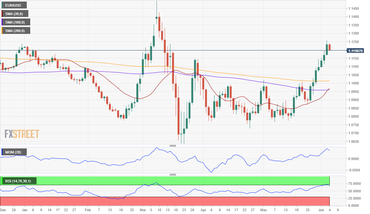 The EUR/USD pair has reclaimed the 1.1200 level this week and is technically overbought. With the ECB and the NFP report in the way, market players could have good reasons to take profits ahead of the weekend, but as long as riots in the US continue and signs of economic recovery keep coming from the EU, the pair has a limited bearish scope. A daily close this Thursday above 1.1220, where it has the weekly 100 SMA, should skew the risk further up.