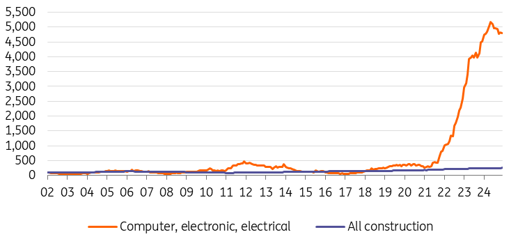 US non-residential construction received a significant boost from President Joe Biden’s incentives to reshore semiconductor manufacturing through the CHIPS Act of 2022 (Creating Helpful Incentives to Produce Semiconductors). The tax credits prompted a sharp increase in the construction of chip fabrication plants, which has been supplemented by the Innovation and Competition Act that authorised $110bn for technology research.