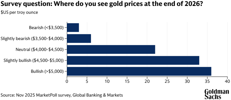 Gold: Prices for the precious metal have hit record highs this year, driven in part by surging central bank buying. Almost 70% of institutional investors expect gold prices to rise further by the end of 2026, according to a poll of more than 900 clients on Goldman Sachs’ Marquee platform conducted from November 12-14. The largest proportion of respondents—36%—think gold will exceed $5,000 per troy ounce by the end of next year (gold traded at $4,158 on November 27).