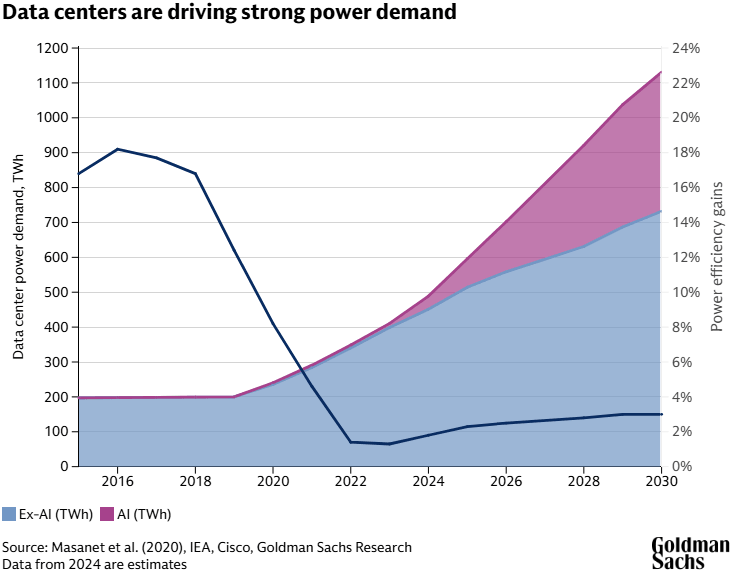 The global power demand from data centers is forecast by Goldman Sachs Research to increase 175% by 2030 (versus 2023) as companies ramp up training for energy-intensive AI models. The jump in power demand is the equivalent of adding another top-10 power consuming country to the world’s power needs.