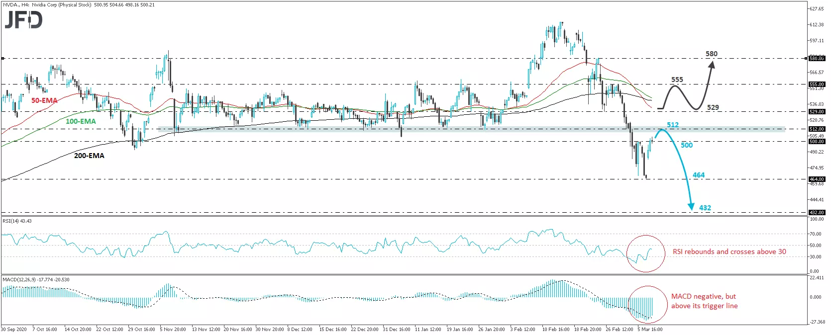 The Nvidia Corporation stock (NASDAQ: NVDA) traded higher on Tuesday, after it hit support at 464 on Monday. The rebound took the price slightly above the psychological zone of 500, which is also Friday’s high, but the move was cut short, with the stock pulling back near that psychological zone. Overall, the price structure on the 4-hour chart remains of lower peaks and lower troughs and thus, despite yesterday’s recovery, we will take a somewhat-negative approach.
