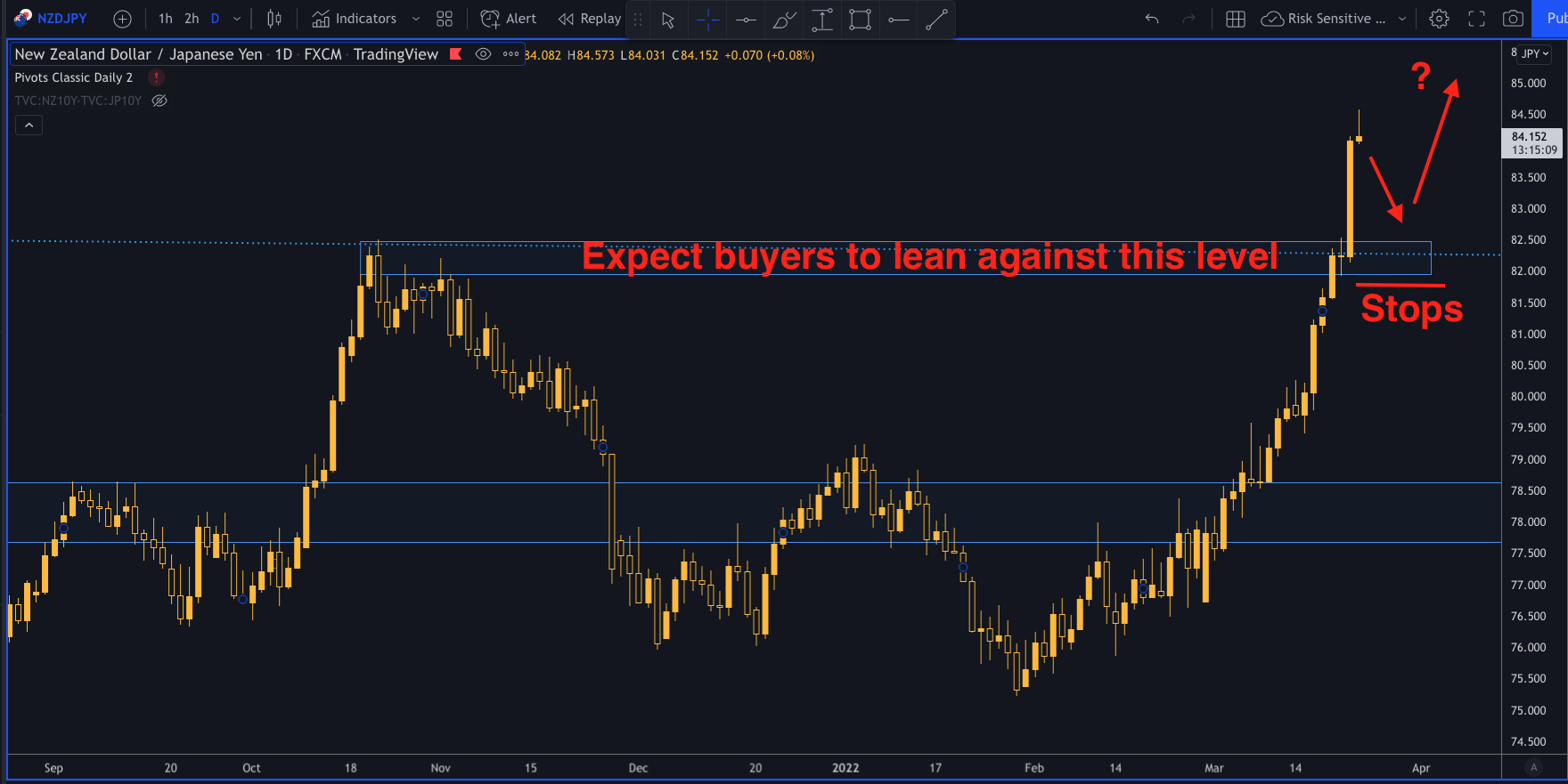 The most obvious place for dip buyers to step in would be against the 82.50 level as that is both a daily high and a weekly trendline area. Furthermore, it means that stops can be fairly closely placed under 81.90 while allowing for another potential leg higher as outlined below.
