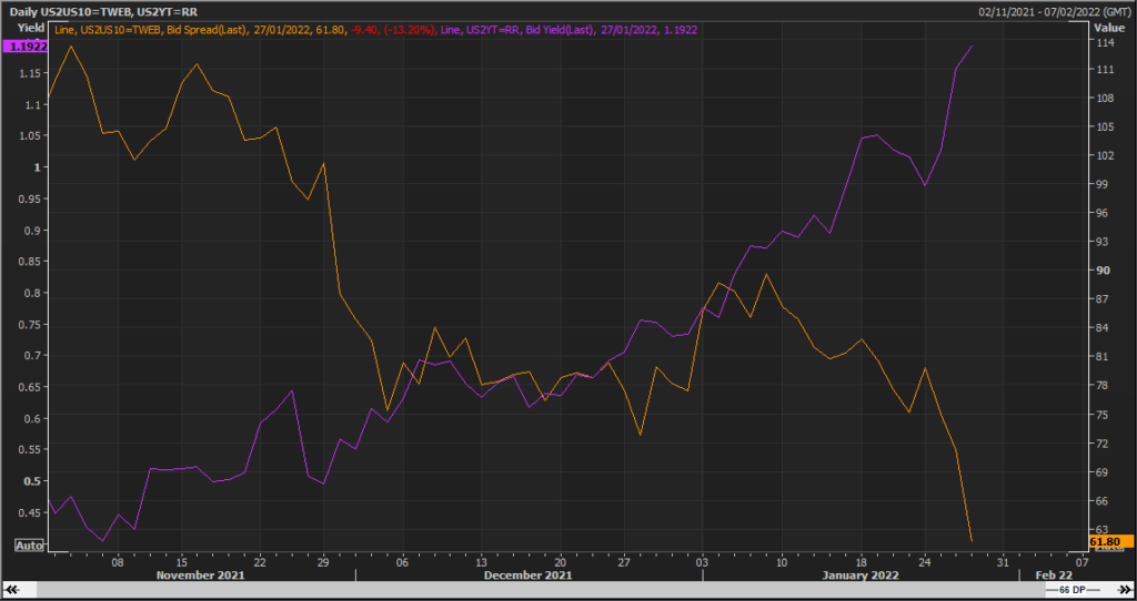 Fed Chair Powell’s post FOMC press conference on Wednesday night, rather than FOMC decision itself, erred to the hawkish side. Traders were quick to grab onto Powell’s comment that the Fed could raise interest rates at every subsequent meeting this year. Those, and other comments from Powell, were enough for some to contemplate a 50bps hike when the Fed meets in March and for quantitative tightening (QT) to commence as soon as May 2022.