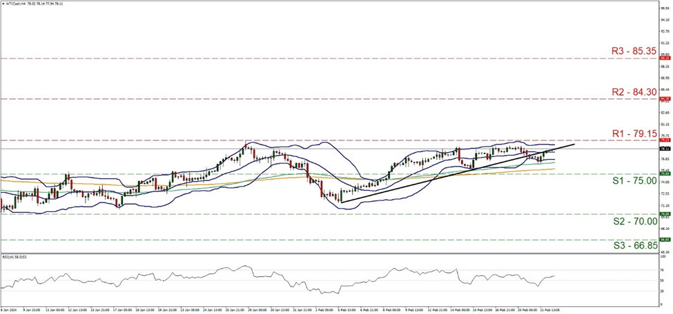 WTI’s price has risen since our last report breaking the 75.00 (S1) resistance line, now turned to support, yet was not able to test the 79.15 (R1) resistance level stabilizing somewhat. We tend to maintain a bias for a continuance of the current sideways motion, between the 75.00 (S1) support line and the 79.15 (R1) resistance level, for the time being, as the upward trend line that was guiding the commodity’s price since the 5th of February, has been broken, signaling the interruption of the upward movement. We also note the narrowing and flattening of the Bollinger bands implying an easing of market volatility for WTI, which could allow the sideways motion to continue. On the other hand, the RSI indicator remains above the reading of 50, implying some bullish predisposition of the market, yet seems to remain unconvincing at the moment. For a bullish outlook, we would require the liquid gold’s price to break the upper boundary of its current sideways motion, namely the 79.15 (R1) resistance line and take aim at the 84.30 (R2) resistance hurdle, which has not experienced any price action since the end of October last year. For an extremely bullish scenario, we would note the 85.35 (R3) resistance barrier. Should on the flip side the bears find a chance to take over, we may see the commodity’s price breaking the 75.00 (S1) support line and aim for the 70.00 (S2) support base. Even lower we note the 66.85 (S3) support level which had formed a floor for WTI’s price action in late May/early June last year.