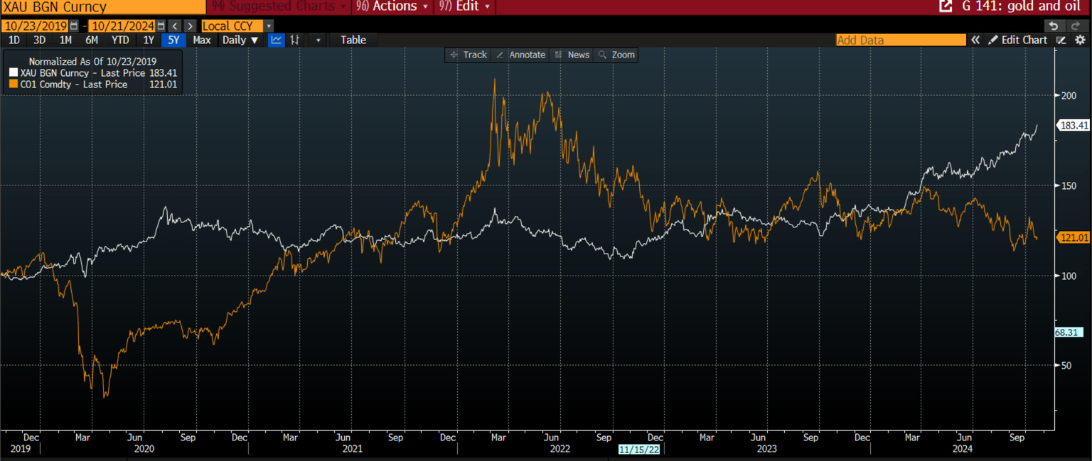 If the oil price is hindered by weak demand, then it could limit the upside potential for global headline inflation. Could this erode demand for gold as an inflation hedge? The oil and the gold price have no correlation of note, which means that they do not move together. However, as you can see in the chart below, there have been periods in the last 5 years when the gold price and the oil price move in opposite directions. This does not seem to last indefinitely. If history repeats itself, then one can assume that the difference between the oil and the gold price will narrow, however, it is hard to pinpoint when this will happen. With gold at a record high, it remains vulnerable to a sell off, which could be triggered by weaker inflation data in the US, or a victory for Kamala Harris at next month’s election.
