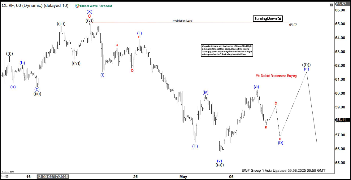 Within wave (Y), the initial decline, wave W, is forming as a zigzag. From the wave (X) high, the price fell to 61.53 (wave (i)), then rallied to 63.92 (wave (ii)). The decline continued in wave (iii) to 56.39, followed by a bounce to 59.87 in wave (iv). The final drop in wave (v) reached 55.30, completing wave ((a)) in a higher degree. Currently, wave ((b)) is unfolding as a zigzag, with its first leg, wave (a), reaching 60.26. A pullback in wave (b) is expected soon, followed by a rise in wave (c) to complete wave ((b)).