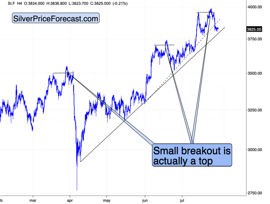 Silver price broke below its upper rising support line, but it hasn’t broken below the lower one yet. Once this level and June high are broken, the door to much lower silver prices will be wide open.