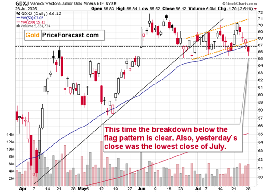 That was also a daily close clearly below the flag pattern. Unlike the mid-July breakdown, this one is clear as GDXJ closed well below the lower border of the pattern, not just slightly so.