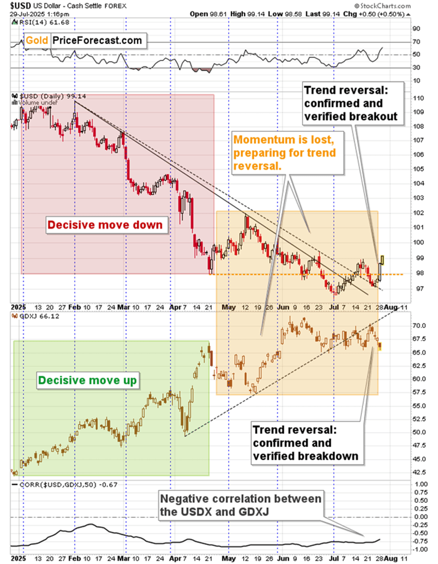 The forex market clearly supports it. The USD Index just moved above 99, and it’s the first time this month that it’s happening.