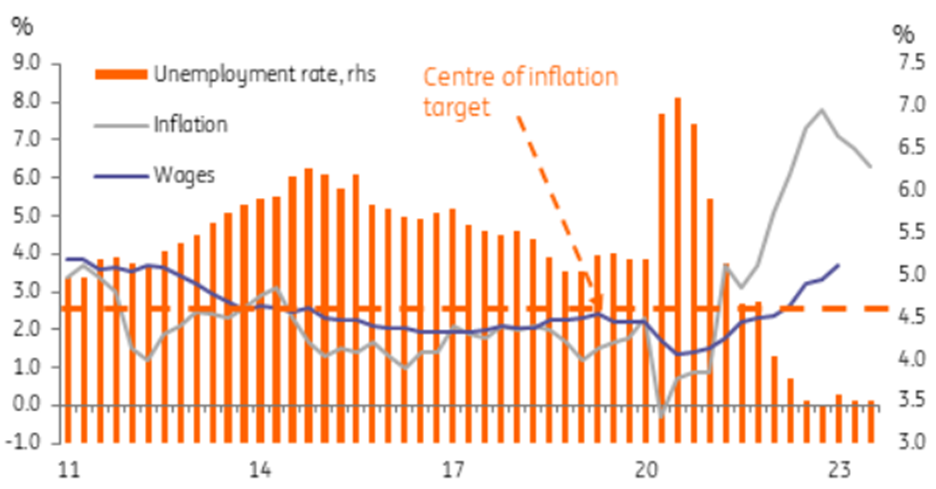 Assuming firms pass on wage growth in prices to maintain their profit margins and with an estimated 1% annual increase in productivity, they should be able to handle wage growth of up to 4% while keeping price increases below the upper limit of the 3% inflation target.