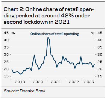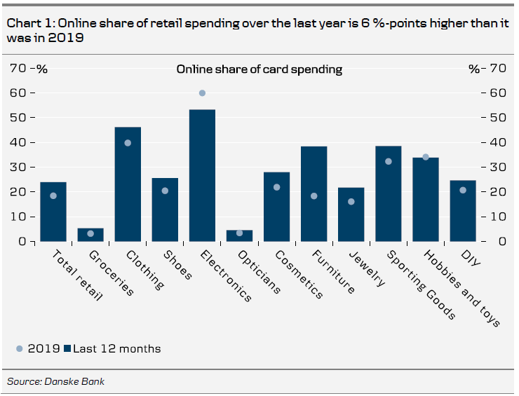Danish card data suggests that a bigger share of retail spending took place online over the past 12 months compared to 2019. That said the vast majority of retail trade still takes place in physical stores.
