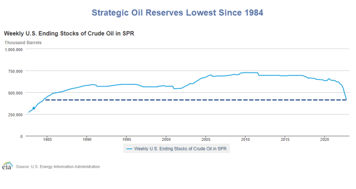 The US Strategic Petroleum Reserve SPR is down about 32 percent from a year ago and the lowest level since 1984.