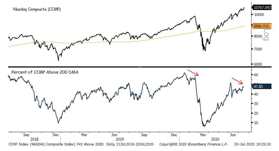 There are striking similarities between investors’ behavior around the millennium change and today. Speculative positioning on the back of extremely optimistic expectations channeled liquidity into the equity market. Investors piled into the tech sector as the first chart above reveals. Meanwhile, eight out of ten key industries flatlined during the same period in terms of fund flows. Digging deeper into the tech sector reveals that not even 50% of its components trade above their 200DMA. The buying is concentrated on very few stocks. A sign that investors are overconfident and pick their darlings among a few stocks from the FAANG+ group.