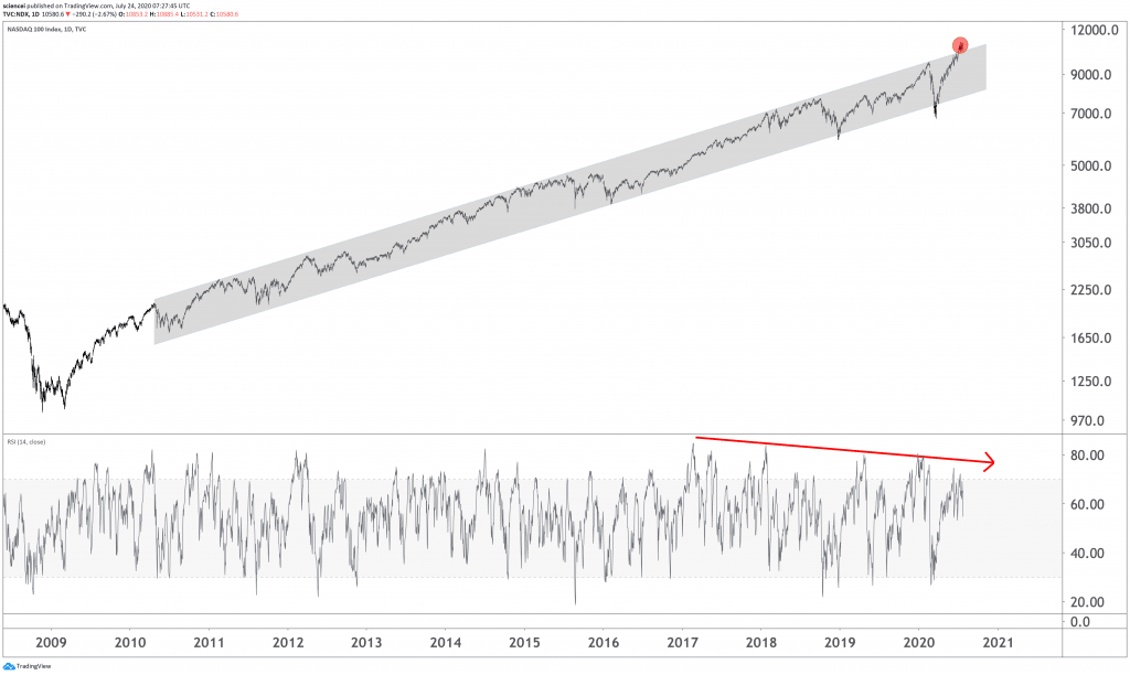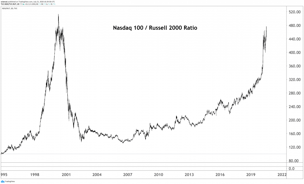 The development led to an overthrow in the Nasdaq 100 index. The pale grey trend had roughly a 19% p.a. total return appreciation over the past decade. That’s already more than double the long-term return history for stocks, which amounted to about 9%. An acceleration of that 19% trend from here on is most likely unsustainable. Moreover, the price premium relative to the 200DMA is the largest since 2000. The Nasdaq 100 has not been as overbought in twenty years according to this metric. Nonetheless, many investors are probably neither aware of technicals nor about the underlying valuations. The chart below shows a Nasdaq 100 to Russel 2000 ratio. It puts tech in relative terms to small caps and shows what happened during the past months. A 50% outperformance accumulated within a short time frame. The last time something similar occurred was during the dotcom bubble in 1998-2000. Once again, investors are partying like it’s 1999. Valuations don’t matter, trends get extrapolated, and the Fed put is part of almost all bullish narratives.