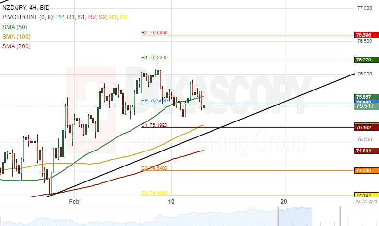 However, the weekly resistance level at 76.22 could provide resistance for the NZD/JPY currency exchange rate during the following trading sessions.