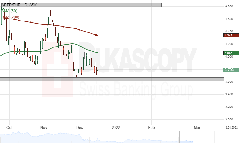 The stock price of Air France in December bounced off the resistance of the 50-day simple moving average and approached the 2021 low-level zone at 3.6225/3.3825. Meanwhile, the 50-day simple moving average was located at 4.0640.