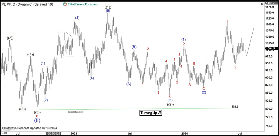Daily chart of Platinum above shows that pullback in wave (II) ended at 802.1. Up from there, wave ((1)) ended at 1148.9 and pullback in wave ((2)) ended at 843.1. The metal then nested higher with wave (1) ended at 1016 and wave (2) ended at 870.1. Up from there, wave 1 ended at 1105 and dips in wave 2 ended at 945.7. Near term while above 802.1, expect the metal to extend higher.