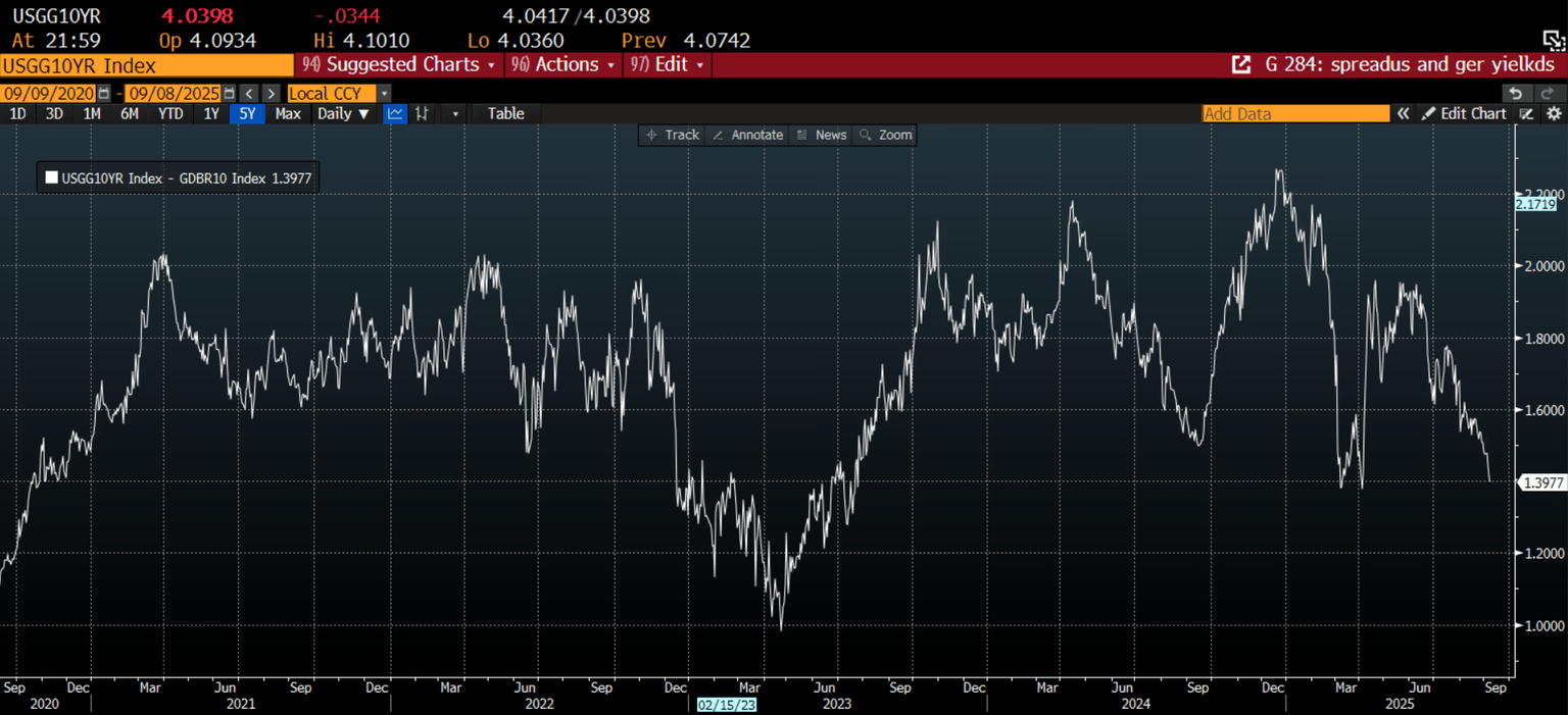 Chart 1: US and German 10-year yield spread. The spread has narrowed sharply as more and more Fed rate cuts get priced in by the interest rate futures market.