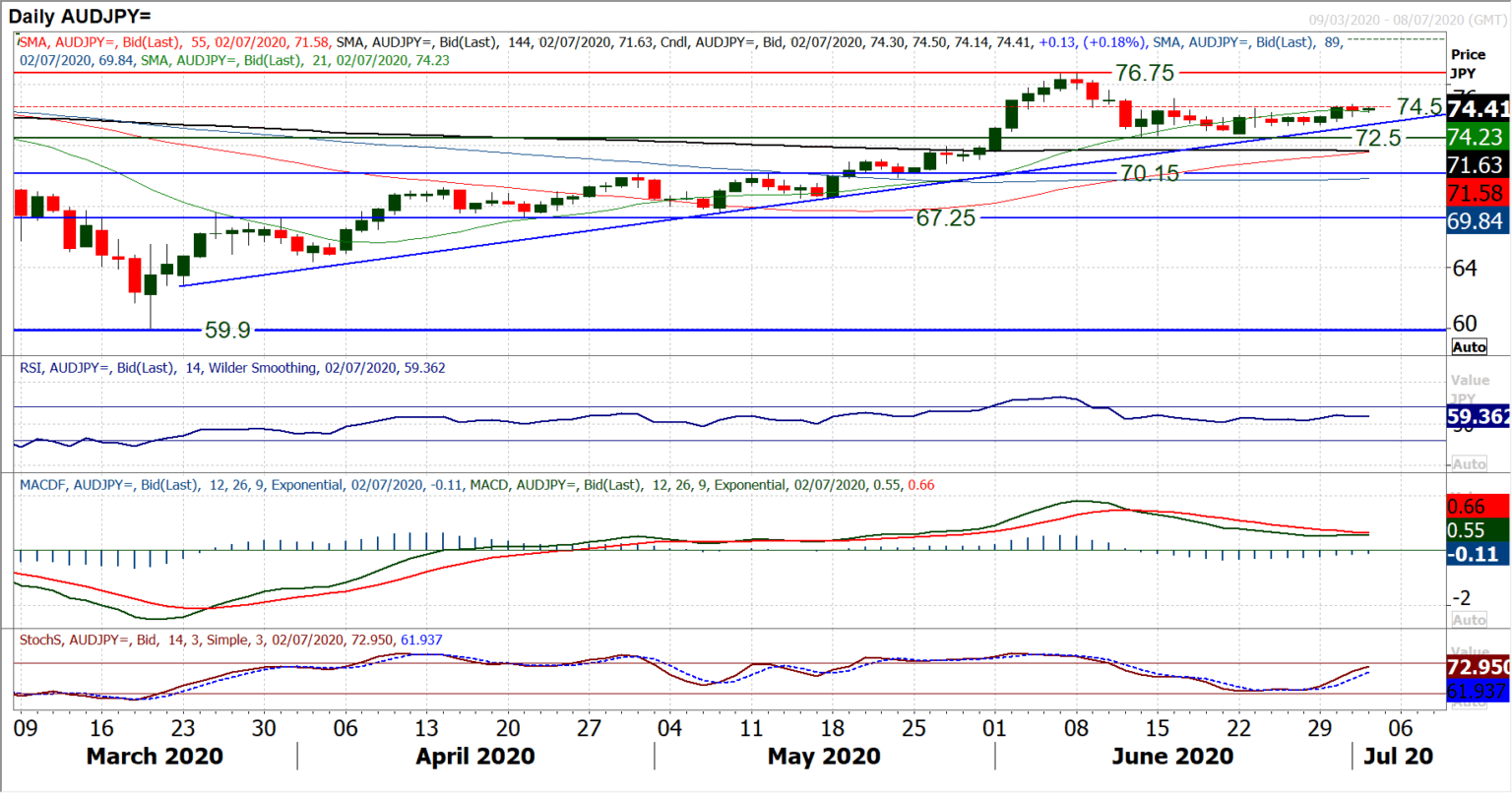 Is risk appetite beginning to improve again? Aussie/Yen is often seen as a key gauge of risk and is just beginning to pick up after a period of correction from early June. Having stabilised a move back from 76.75 around 72.50/72.75, the major cross has been taking its time in finding buyers once more. After a couple of weeks of consolidation, something looks to be brewing for the bulls. With the underpinning of support from a three month uptrend, the magnitude of positive candles in the past week or so are beginning to pull the market higher once more. Candles this week have been encouraging and show an appetite to buy into intraday weakness now, on a succession of higher daily lows. Pressure is mounting on the 74.50 pivot area. A close above this resistance would really suggest positive traction is building. The improvement is already coming through, as the Stochastics rise in the wake of a bull cross, and RSI is also looking to move into the 60s. Given the consolidation in recent weeks, it would be wise to see confirmation of an upside break before looking to buy. However, there is now decent support building around 73.20/73.30, around where the three month uptrend comes in today. A move above 75.05 would re-engage upside traction for a retest of 76.75.