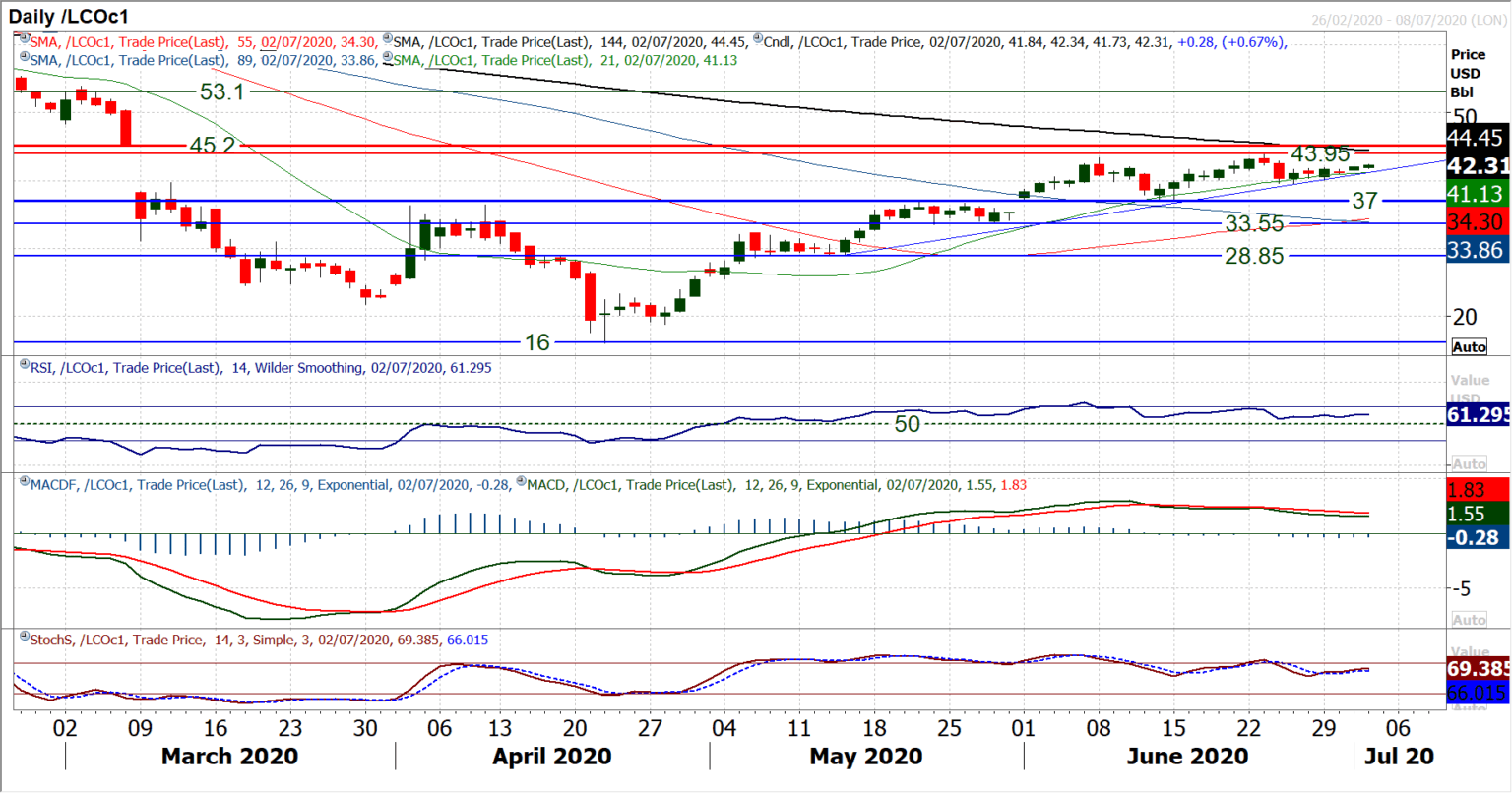 Although the market looks to be struggling for traction, there is still a mild positive bias that comes with the market tracking higher over the past few sessions. Brent Crude is a market that may have lost some of its drive, but it is still gaining ground nonetheless. This does however leave us slightly more cautious than we have been previously been over the continuation of the trend higher. This is a recovery which has seen uptrends shallowed out on several occasions in recent weeks. Faltering positive momentum configuration also requires attention. Negative divergences on RSI and Stochastics, whilst MACD lines bear crossing all lend caution as to how far the bulls can take this move without a correction. What is likely is that the market is in the process now of building a medium term range. Support at $36.40/$37.00 remains strong but the resistance of the highs at $43.40/$43.95 and the importance of the gap at $45.20 suggests this is a growing problem for the bulls to continue higher. Initial support of the past couple of sessions at $40.90/$41.05 is needed to hold to maintain the mild positive bias. The importance of support at $39.50/$40.00 is growing.