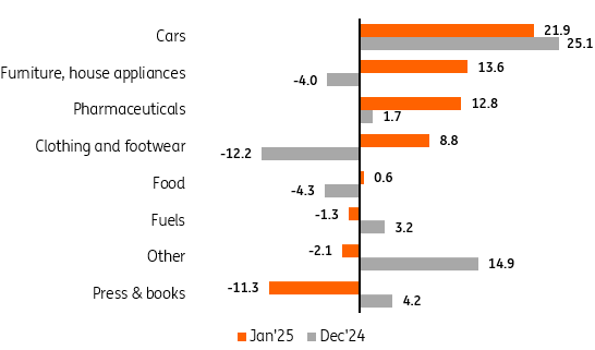 Retail sales of goods increased by 4.8% year-on-year (YoY) in January, surpassing ING's forecast of 2.0% and the consensus estimate of 1.5%. This follows a 1.5% YoY rise in December 2024. Seasonally adjusted data indicates a 0.6% month-on-month (MoM) growth in sales.